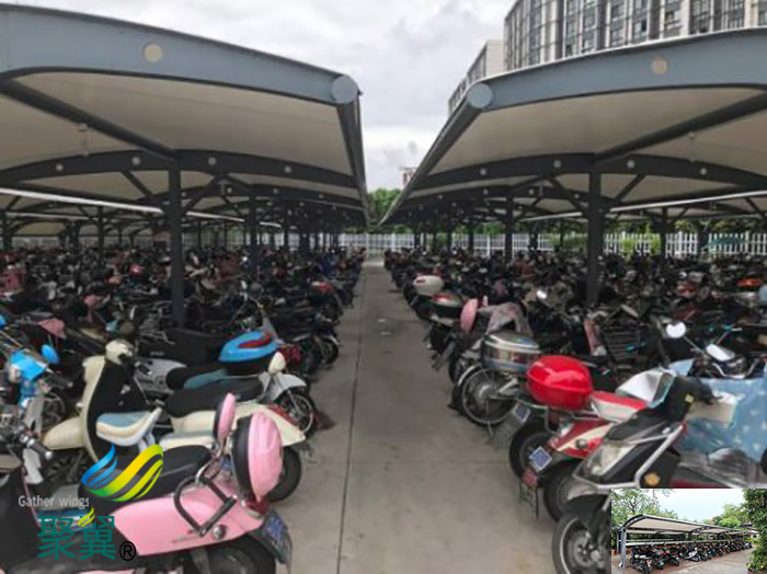 合肥小區(qū)張拉鋼膜結(jié)構(gòu)非機(jī)動(dòng)汽車停車棚安裝施工效果圖