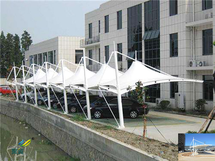 膜結構車棚的篷布材質是膜結構,而膜材的最大特點是強度高、耐久性好、防火難燃、自潔性好,不受紫外線影響,使用壽命長,一般15-30年。具有高透光率,透光率為13%,對熱能反射率73%,熱吸收量很少。正是因為這種劃時代的膜材料的發明,使膜結構車棚成為現代化的永久建筑。鑒與此,膜結構造型的停車棚在停車場建設中也以其優美的造型和實在的功能擔當重要角色,是您的愛車最佳安身之所。