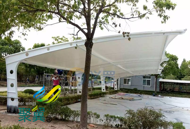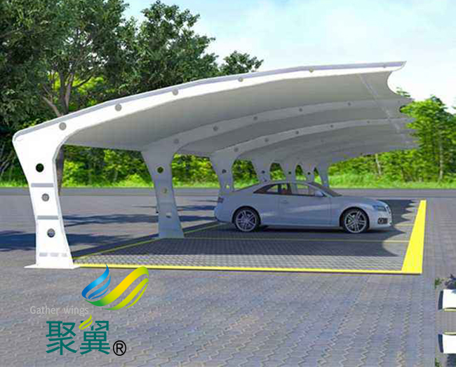 膜結構車棚PVC材料的主要特點是強度低、彈性大、易老化、徐變大、自潔性差,但膜結構車棚價格便宜,容易加工制作,色彩豐富,抗折疊性能好。