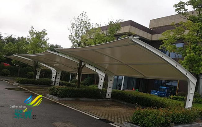 膜結構車棚修建在裝置鋼結構完結以后,鋼結構銜接點焊接的當地再油漆進行補噴油漆,這么白白凈凈的膜結構車棚就出來了。
