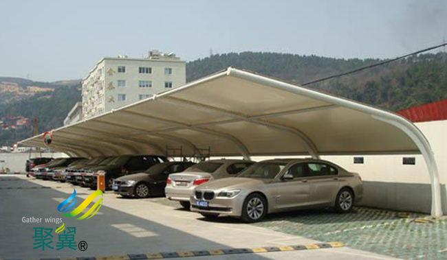 膜結構車棚*值得一提的是膜結構車棚可以根據支撐構件的位置和高低排列組成不同的形狀,這在金屬膜結構車棚上是無法想象的。所以膜結構車棚可以通過自身柔美的曲線和周圍的藝術景觀結合起來,給人以美的享受。膜結構車棚是一種公用建筑物,這種產品的首要要求就是耐用穩固,膜結構車棚都是鋼構支撐柱,然后其上進行焊接等工藝加裝膜材料頂棚。