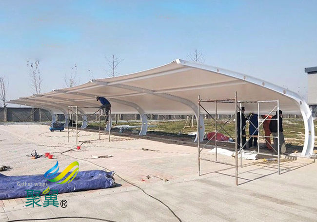 膜結(jié)構(gòu)車棚安裝過(guò)程中,應(yīng)充分注意風(fēng)速和風(fēng)向,避免振動(dòng)現(xiàn)象,同時(shí),應(yīng)根據(jù)降雨量大小決定工程的暫停和延續(xù)。膜結(jié)構(gòu)車棚安裝過(guò)程中不應(yīng)該儲(chǔ)存雨水,同時(shí),應(yīng)根據(jù)降雨量大小決定工程的暫停和延續(xù)。