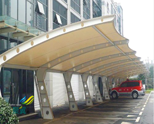 膜結構車棚,相對不同的停車棚還是很有優勢的,不僅構造簡單,材料少,花樣也很多,一般的用戶都會選擇膜結構車棚