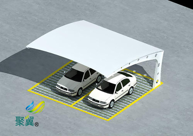 覆蓋大跨度空間, 膜結構車棚中所使用的膜材料每平方壹公斤左右,由于自重輕,加上鋼索、鋼結構高強度材料的采用,與受力體系簡潔合理——力大部分以軸力傳遞,故使 膜結構車棚適合跨越大空間而形成開闊的無柱大跨度結構體系。