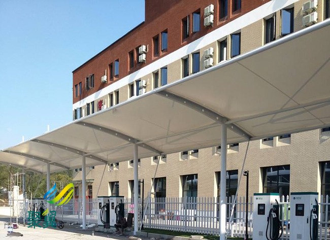 膜結(jié)構(gòu)車棚自潔性。膜建筑中采用具有防護(hù)涂層的膜材,本身不發(fā)黏,落到膜材表面的灰塵可以靠雨水的自然沖洗而達(dá)到良好的自潔效果,同時(shí)膜結(jié)構(gòu)車棚保證建筑的使用壽命。