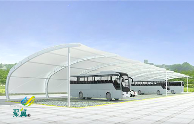 膜結(jié)構(gòu)車棚輕巧、別致的造型在停車場及候車廳的建設(shè)中擔(dān)當(dāng)了重要角色,除了滿足防風(fēng)雨、防日曬等基本功能外,并有較好的標(biāo)識招攬效果,展現(xiàn)了人們個性化的一面。