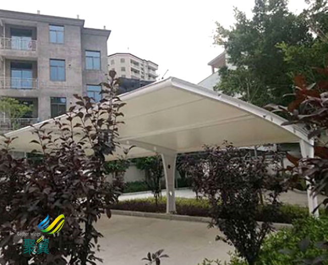 膜結(jié)構(gòu)車棚具有良好的自潔性、隔熱性和耐久性,還有外型新穎、自重輕等的優(yōu)點(diǎn),所以被普遍的應(yīng)用在各類休閑小品和輕型大跨度無柱空間以及輕型屋蓋建筑結(jié)構(gòu)上。