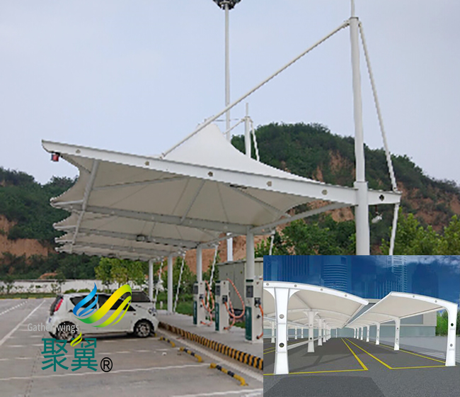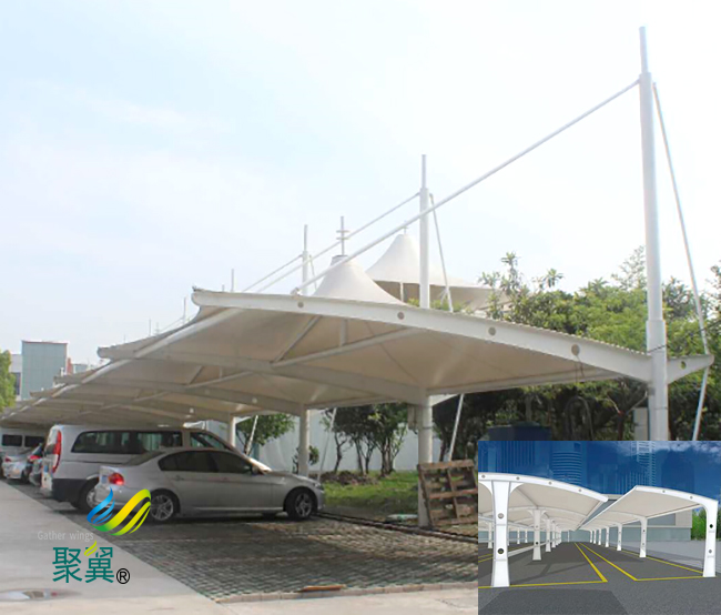 膜結構車棚工期短。膜結構車棚建筑基本上都是在工廠之內完成制作以及加工的,因此膜結構車棚可以大大降低現場施工時間,比起傳統建筑來說,工期大大縮短。 膜結構車棚膜材優異的透光性能可以在白天吸收自然光照,夜晚還能節約一定的人工照明。膜結構車棚有效節約了一部分能源,某種程度上還能降低一定的使用成本。 膜結構車棚工期較短的性能也決定了其可以被廣泛應用在各種體育場所、生活場所以及其他工業場所等。