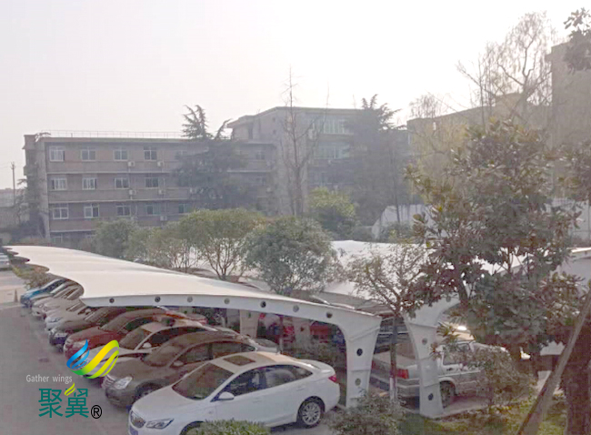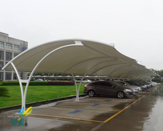 膜結構車棚防火性與抗震性,膜結構建筑所采用的膜材具有卓越的阻燃性和耐高溫性,故能很好的滿足防火要求。由于膜結構車棚結構自重輕,又為柔性結構且有較大變形能力,故抗震性能好。