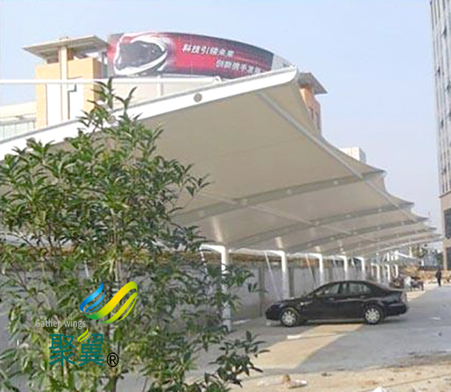 結構車棚大跨度。膜結構自重輕、抗震性能好,可以不需要內部支承,膜結構車棚克服了傳統結構在大跨度(無支撐)建筑上實現所遇到的困難,可創造巨大的無遮擋可視空間,有效增加空間使用面積。