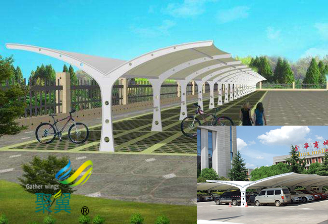 膜結構車棚膜材料具有高強度的特點,再加上張拉技術的應用,根據力學原因構造外圍,使得膜結構車棚自行車車棚的支撐力和強度遠遠高于其他材料。