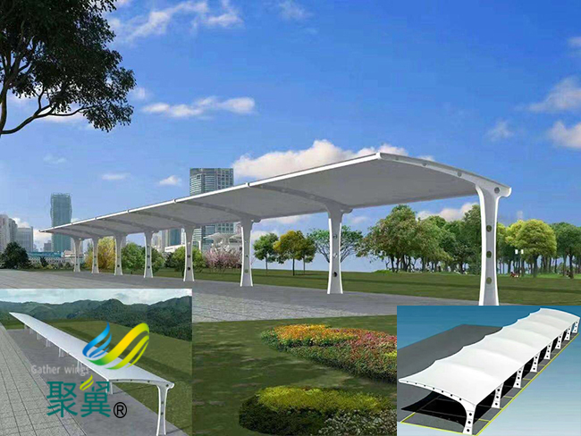 膜結構車棚改變了傳統的直線條建筑風格,用膜結構車棚特有的曲面造型,呈現出了一種簡單大方、明亮輕快、膜結構車棚剛柔并濟、力量與美麗的完美結合。上海聚翼膜結構車棚給人眼前一亮的感覺,也讓更多的建筑工程師們擴展了想象的空間。