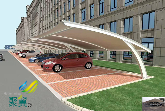 膜結(jié)構(gòu)車棚本身是依靠膜自身的張拉應(yīng)力與支撐桿和拉索共同構(gòu)成的體系,此結(jié)構(gòu)特別適合用來建造城市標志性建筑物,如體育與娛樂性場館,廣告效應(yīng)的商場、餐廳、城市的命脈的關(guān)鍵性建筑,這時新型膜材用于此可以體現(xiàn)出更好的益處。