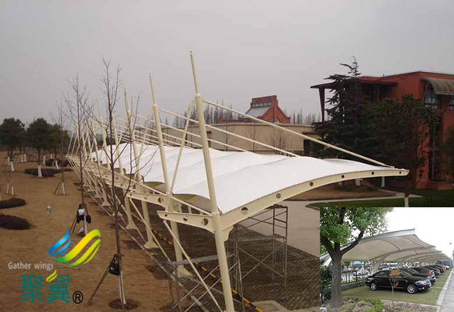 膜結構車棚如遇上勁風氣候,柱、主梁、支撐等大構件應立即進行校對,方位校對精確后立即進行固定,以避免發生單側失穩。當天裝置的構件,應構成空間穩固體系。