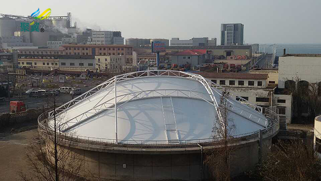 膜結構污水池加蓋使用抗酸、堿腐蝕的環境膜材作為密封材料,可有效延長密封罩的使用年限。除此之外,膜材還有質輕,易安裝的屬性。