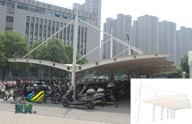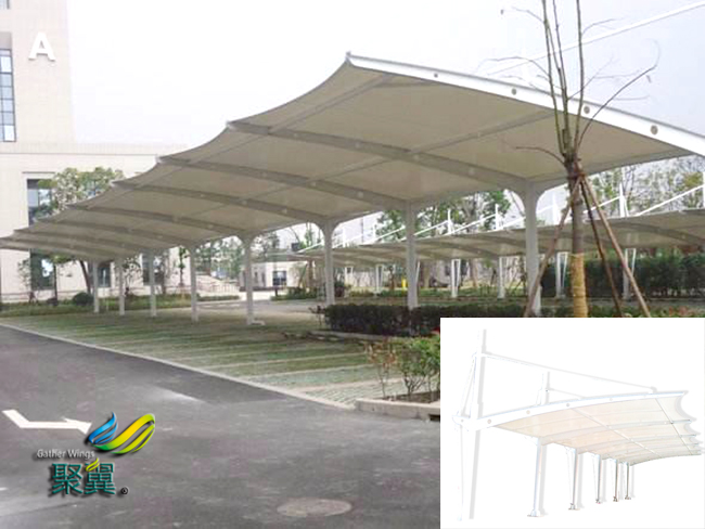 膜結構車棚是提供給車輛停泊的地方,使車輛避免了風吹雨打。來保護自行車,汽車等不受損傷。在膜結構車棚未出現之前,市場主要的是鐵制膜結構車棚,鋁合金車棚,彩鋼車棚等。這些膜結構車棚都是采用金屬構件來制作,因此具有笨重,形式單調的缺點,沒有個性和美觀。