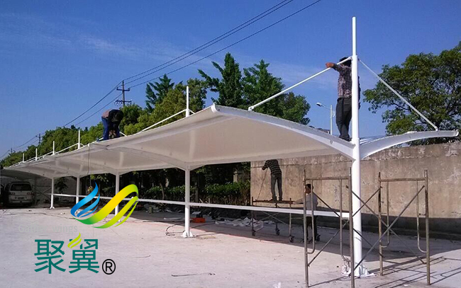 膜結構車棚膜材及其支承構件(鋼結構)組成的建筑物或構筑物,膜結構車棚膜材,由高強度纖維織成的基材和聚合物涂層構成的復合材料。