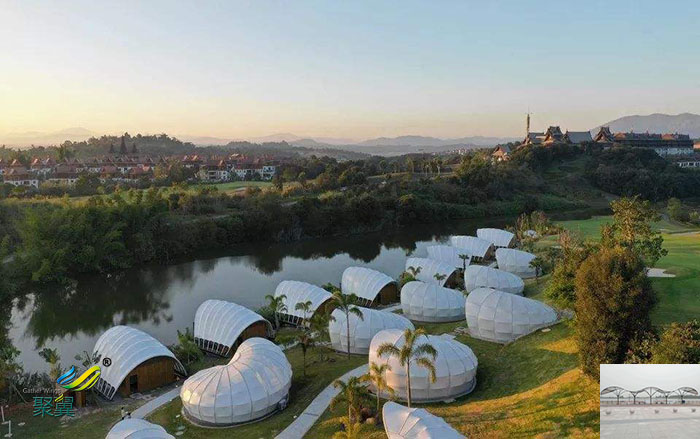 4.膜結構建筑自潔性:膜建筑中采用具有防護涂層的膜材,可使建筑具有良好的自潔效果,同時保證建筑的使用壽命。