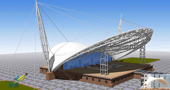 1、舞臺(tái)張拉膜結(jié)構(gòu)的共同曲面外形使其具有激烈的雕塑感,膜面經(jīng)過張力到達(dá)自平衡。