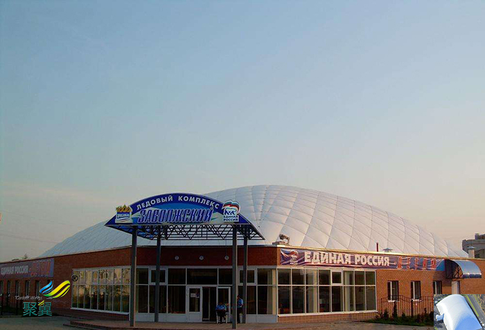 一:經濟性,由于膜材具有一定的透光率,白天可減少照明強度和時間,能很好地節約能源。同時夜間彩燈透射形成的絢爛景觀也能達到很好的廣告宣傳效益。膜建筑屋面重量僅為常規鋼屋面的1/30,這就降低了墻體和基礎的造價。同時充氣膜建筑奇特的造型和夜景效果有明顯的“建筑可識性”和商業效應,其價格效益比更高。