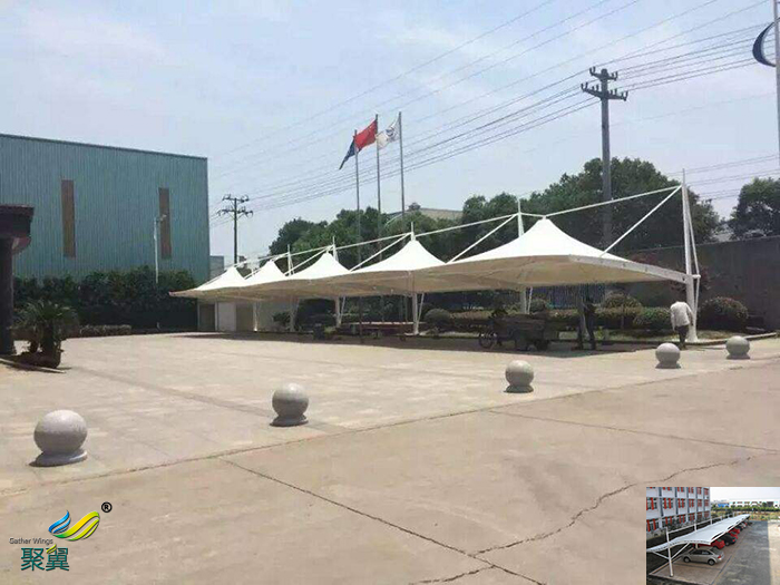 1.膜結構車棚上膜的時,務必根據(jù)安裝需要加工制作成的膜成品鋪開,按圖紙技術要求在地面預組裝。
