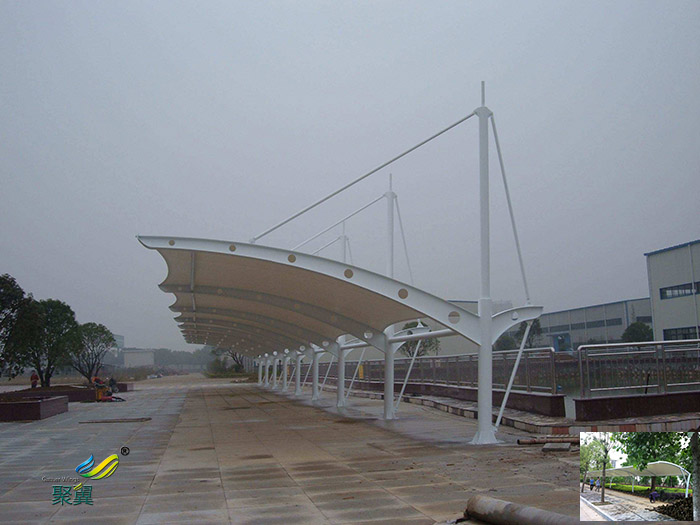 膜結構非機動車車棚,是以建筑織物,即膜材料為張拉主體,與支撐構件或拉索共同組成的結構體系,它以其新穎獨特的建筑造型,膜結構非機動車車棚良好的受力特點——成為大跨度空間結構的主要形式之一。膜材料是指聚酯纖維基布或PVDF、PVF、PTFE等不同的表面涂層,膜結構非機動車車棚配以優質的PVC組成的具有穩定的形態,并可承受一定載荷的建筑紡織品。它的壽命因不同的表面涂層而異,一般可達成10-20年。