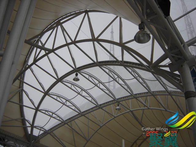安裝細節:主體為鋼構焊接,采用主框架與部分結構同步安裝施工,并完成局部補油漆、進行防火處理等。膜布廠內加工成品現場安裝細節處理,本廠施工負責人專職人員檢測后交于施工項目經理驗收。