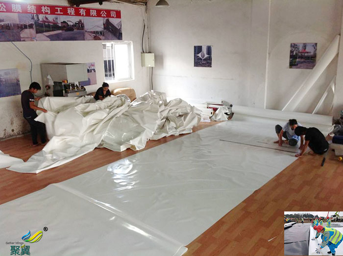 2、PVC建筑膜材開發和應用得比較早,通常規定PVC涂層在玻璃纖維織物經緯線交點上的厚度不能少于0.2mm,一般涂層不會太厚,達到使用要求即可。PVC本身不耐老化,多用于臨時建筑。